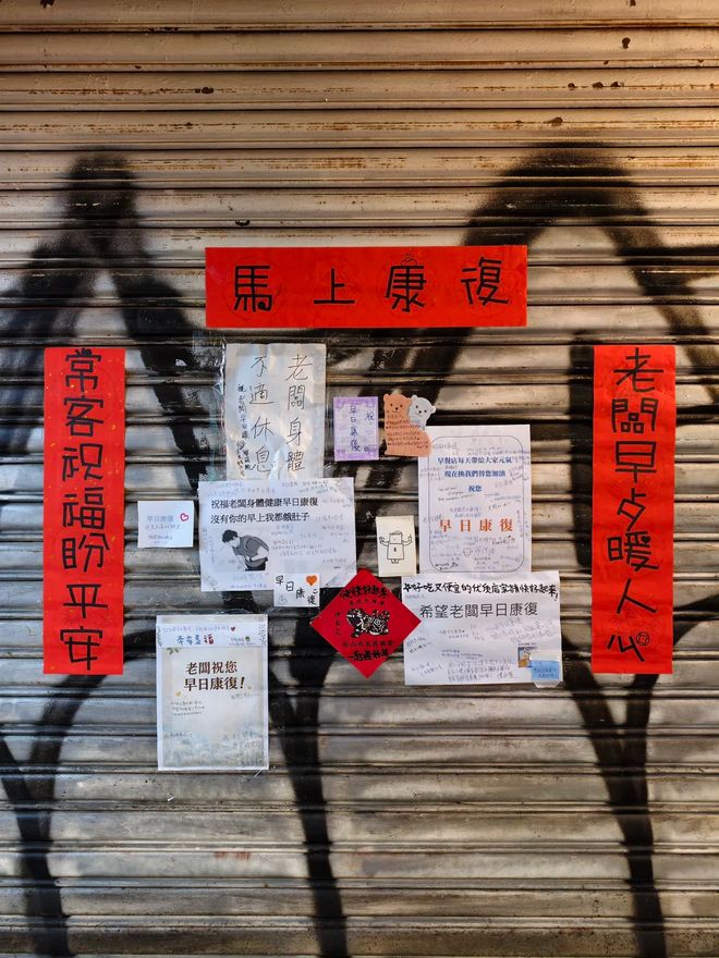 很快,在两个多礼拜里,这家店铺的铁门上贴满了各式各样的纸条,祝福老板早日康复。